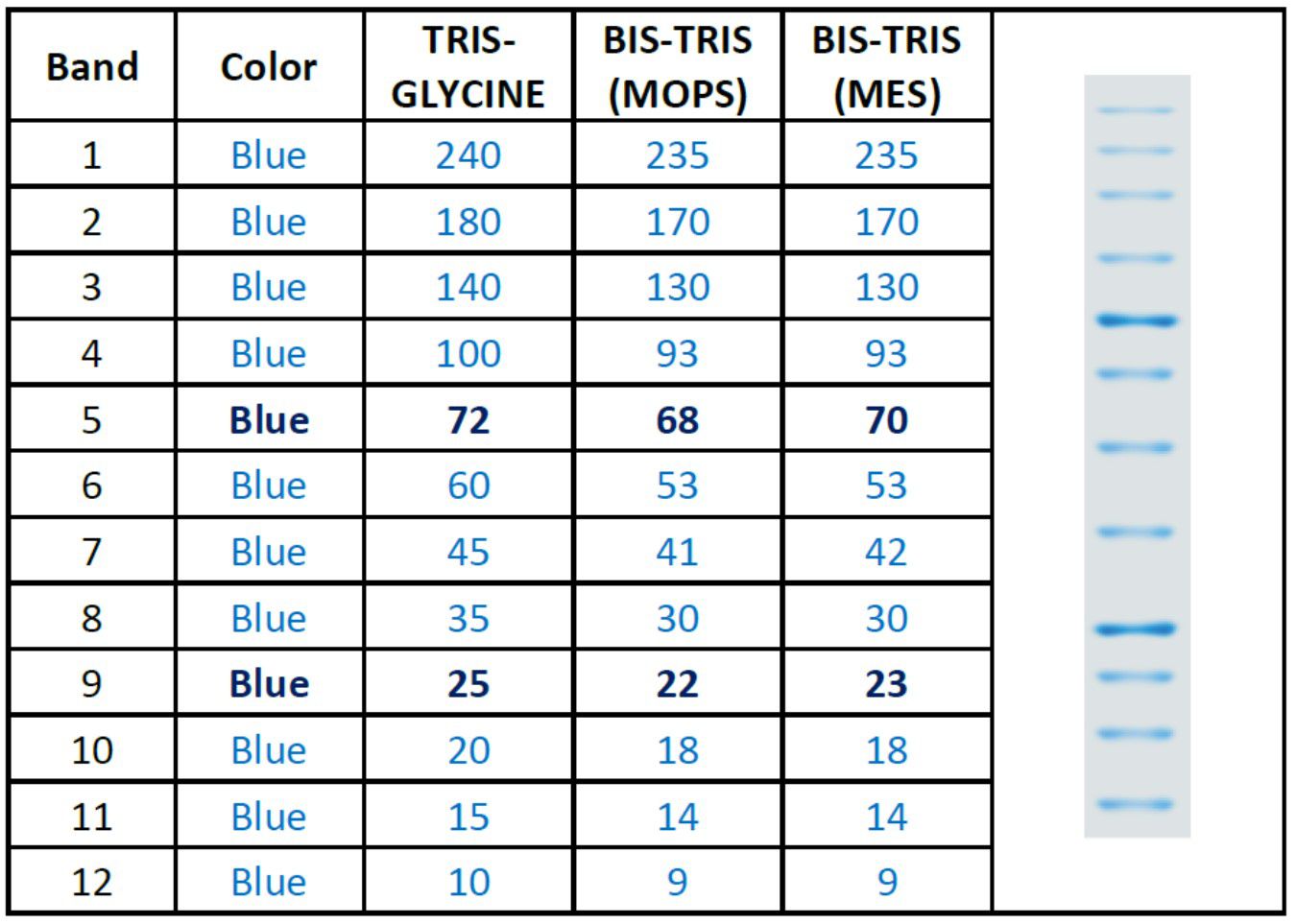 Under suggested conditions, PM1700 ExcelBand™ All Blue Broad Range Protein Marker resolves 12 major bands in SDS-PAGE (Tris-Glycine buffer, MOPS, and MES buffer) and after Western blotting to nitrocellulose membrane.